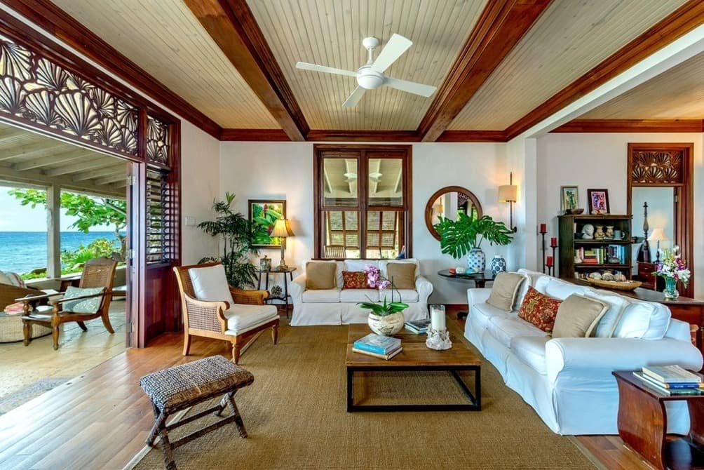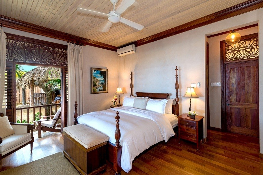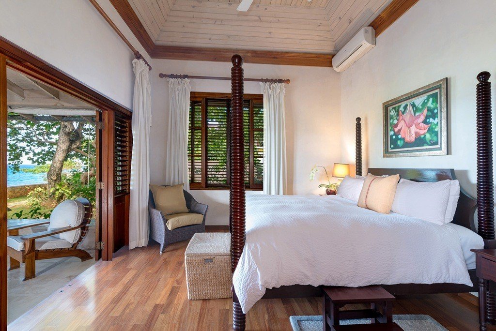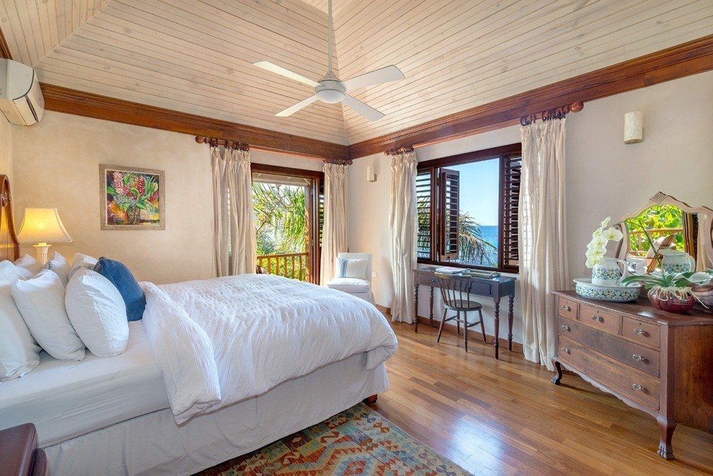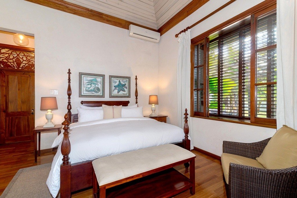 Each bedroom in the main house includes a private balcony with panoramic views, air-conditioning, and a modern en-suite bathroom. Louvered windows and doors allow ocean breezes to flow through, so guests can fall asleep to the sound of waves gently lapping the shore. Tucked behind lush almond and seagrape trees is a quaint, private cottage—ideal for a romantic escape, complete with a living area, kitchenette, and secluded Jacuzzi