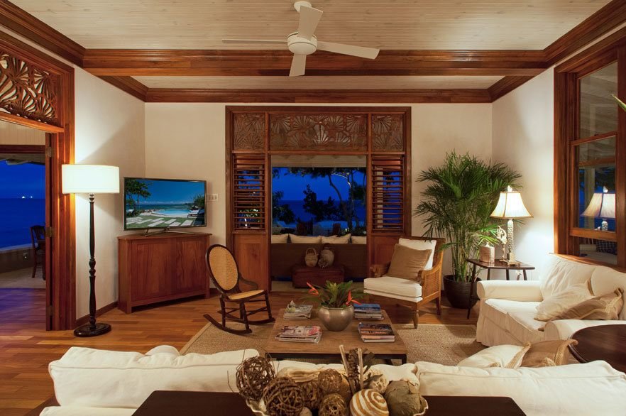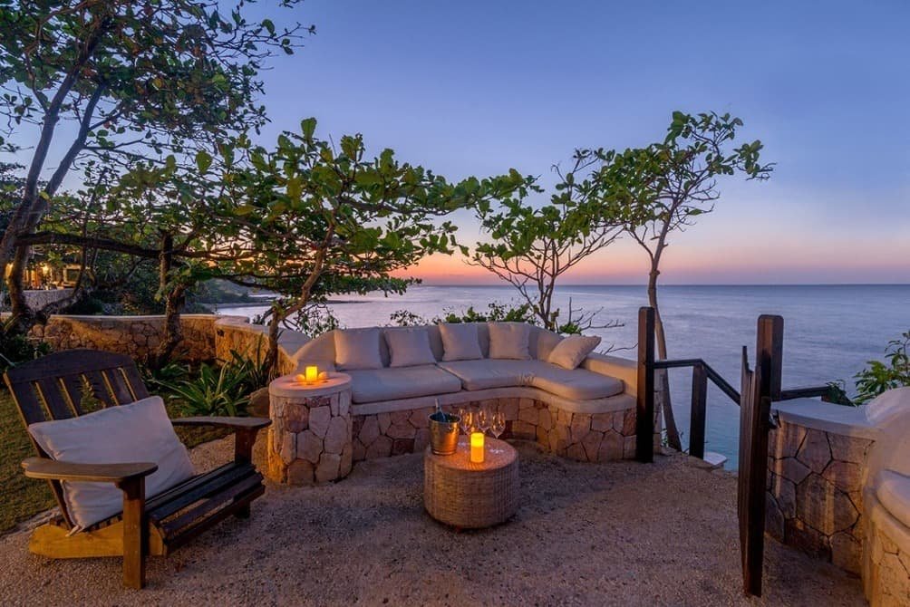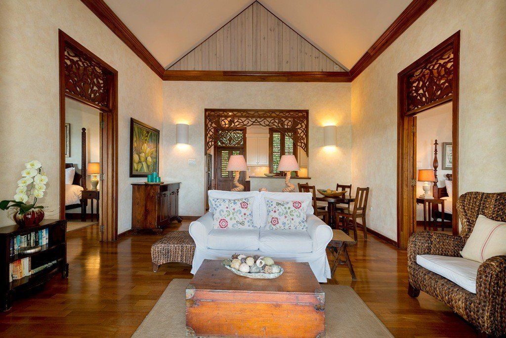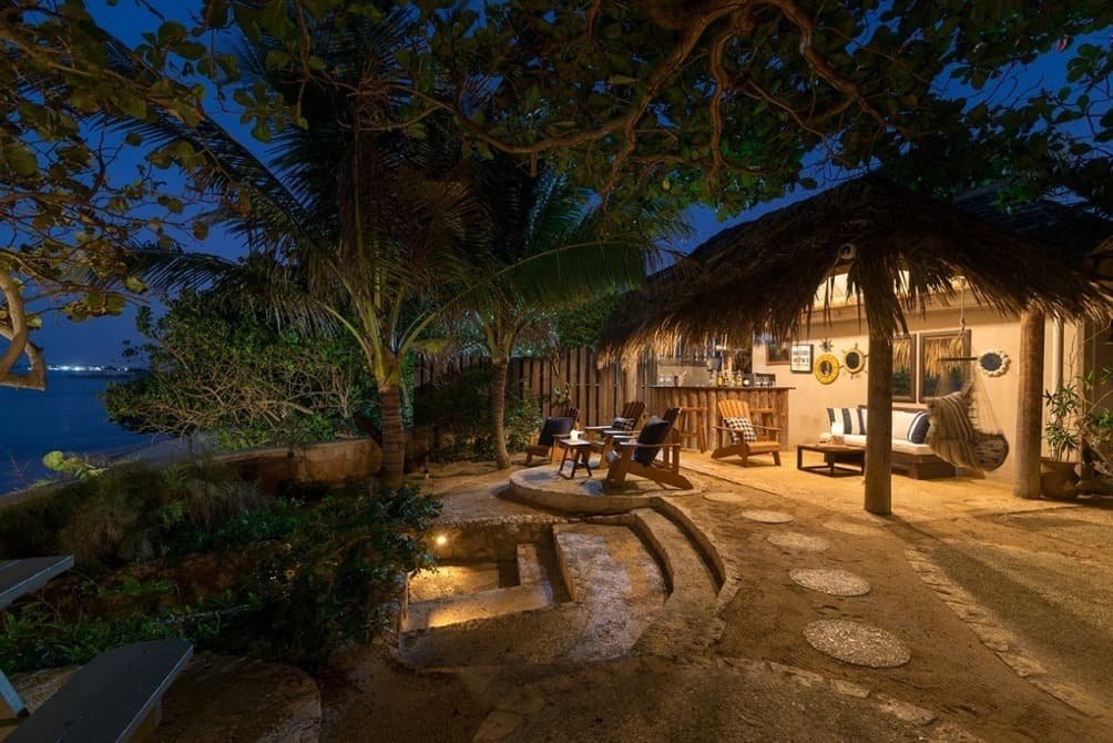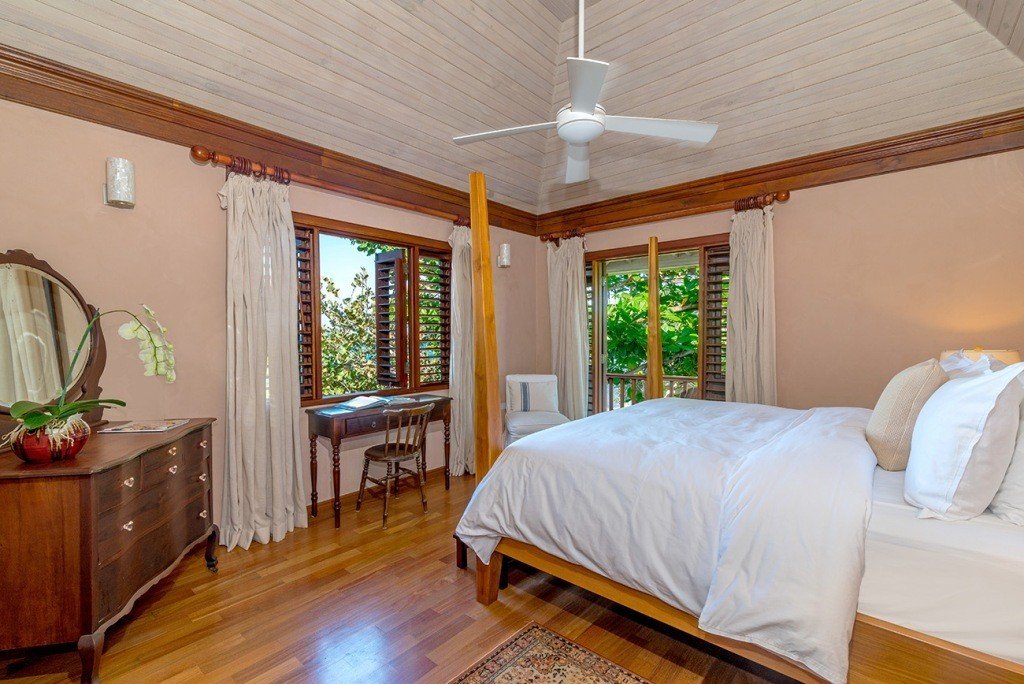 Each bedroom in the main house includes a private balcony with panoramic views, air-conditioning, and a modern en-suite bathroom. Louvered windows and doors allow ocean breezes to flow through, so guests can fall asleep to the sound of waves gently lapping the shore. Tucked behind lush almond and seagrape trees is a quaint, private cottage—ideal for a romantic escape, complete with a living area, kitchenette, and secluded Jacuzzi