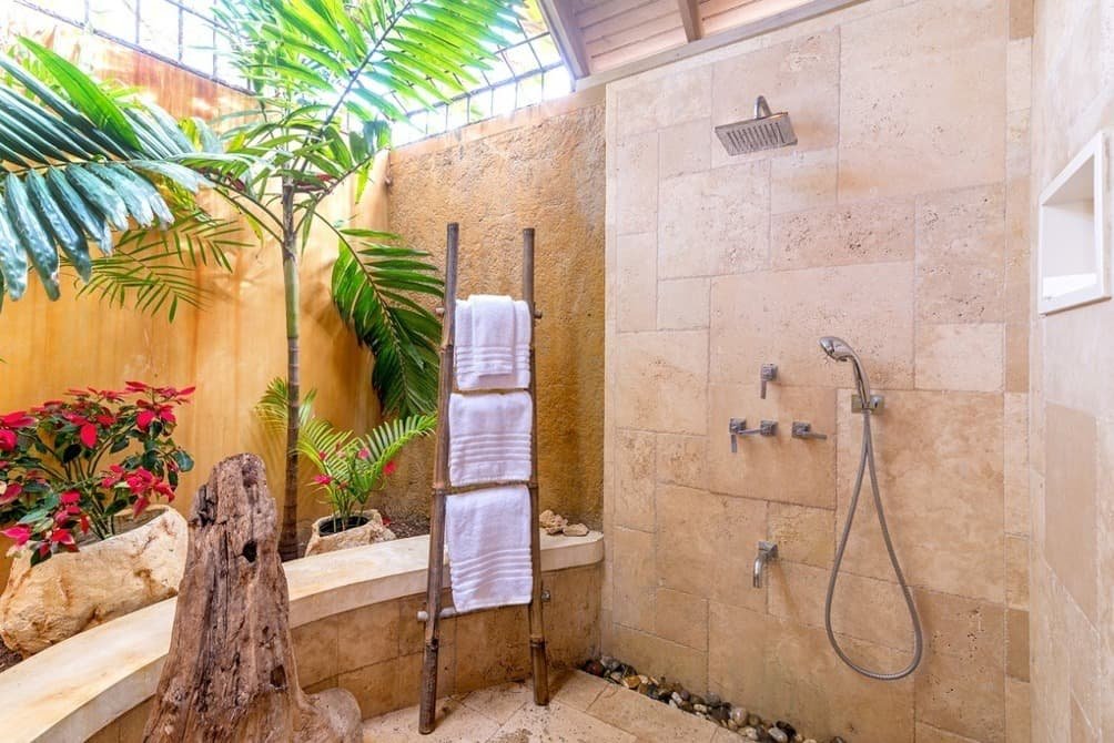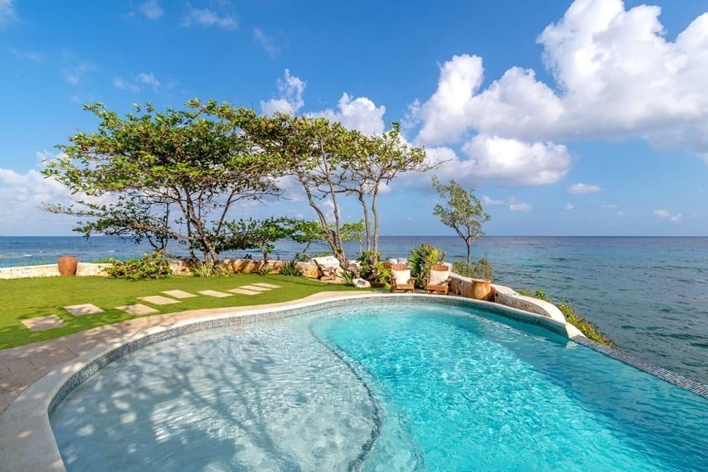 The main house features four spacious bedrooms and four-and-a-half bathrooms. A beautifully designed freeform freshwater infinity pool sits just in front of the villa, offering full ocean views and the perfect spot to relax and unwind. A few steps away is a charming guest house with two additional bedrooms and bathrooms, its own oversized Jacuzzi, and a full kitchen—also with stunning sea views.