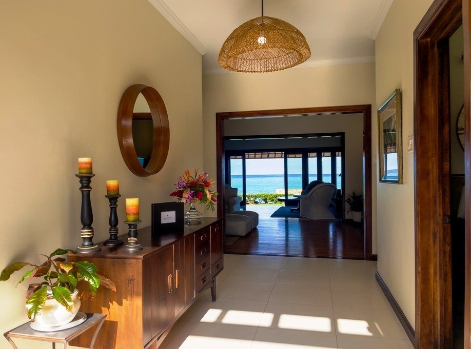 This beautifully renovated five-bedroom, five-bathroom beachfront retreat offers the ultimate luxury escape. Set within lush, manicured gardens, this tranquil oasis is designed for relaxation and elegant island living.
