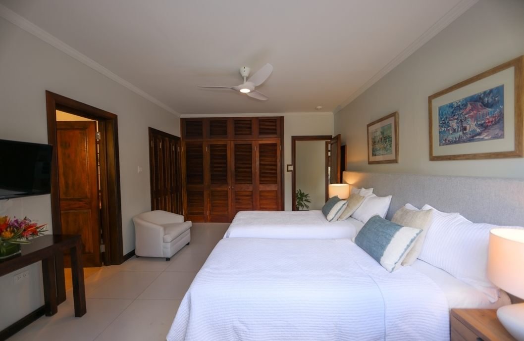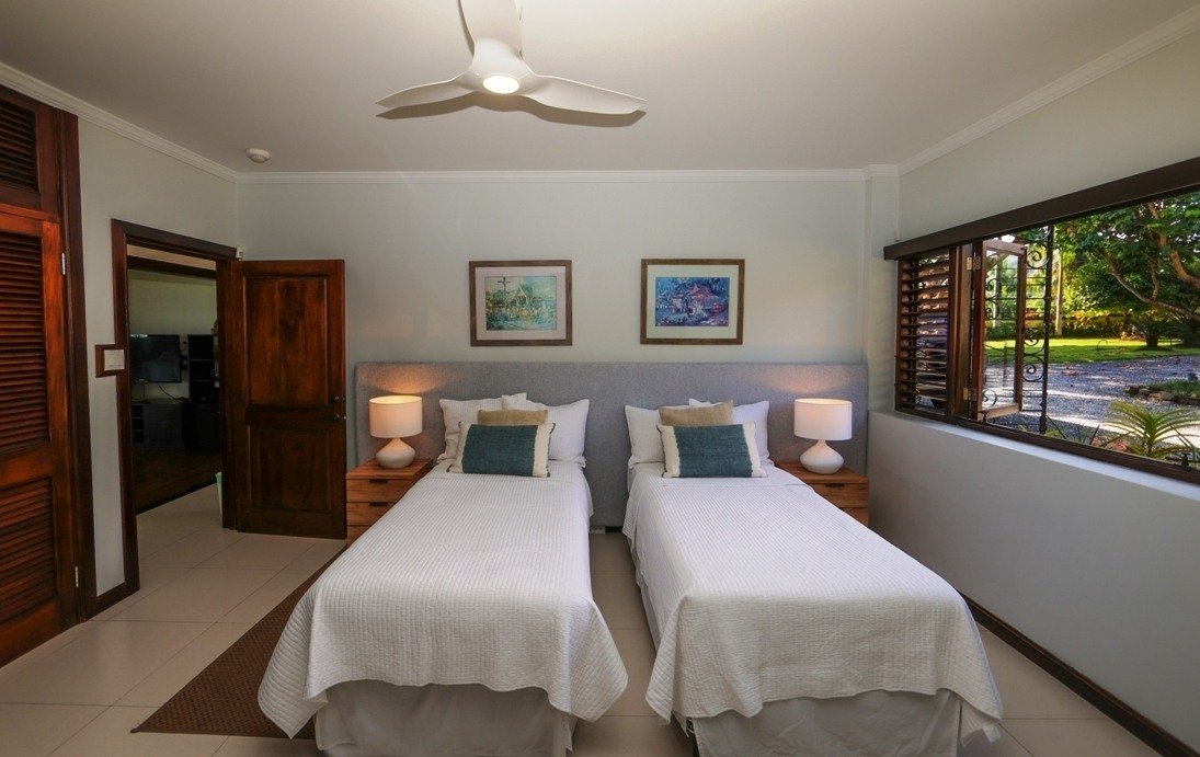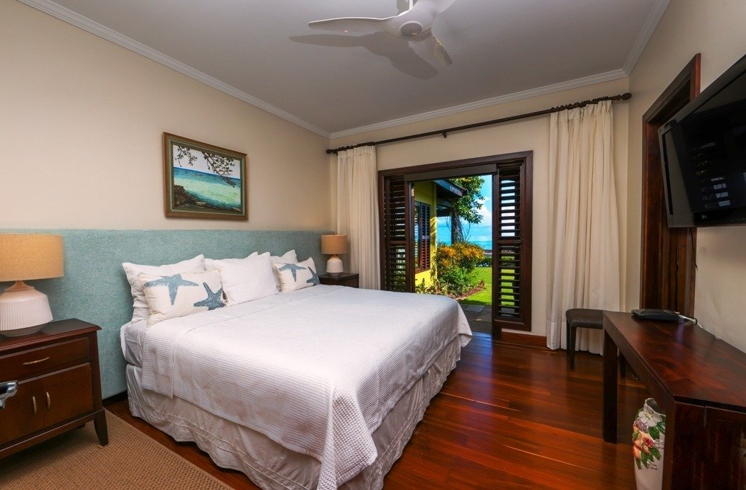 Bedrooms: All five air-conditioned bedrooms include ceiling fans, cable TV, personal safes, and modern en-suite bathrooms with updated fixtures and elegant design touches.