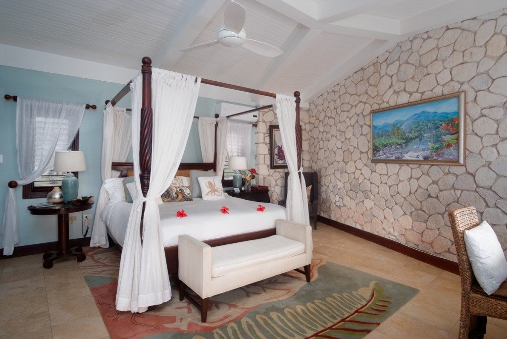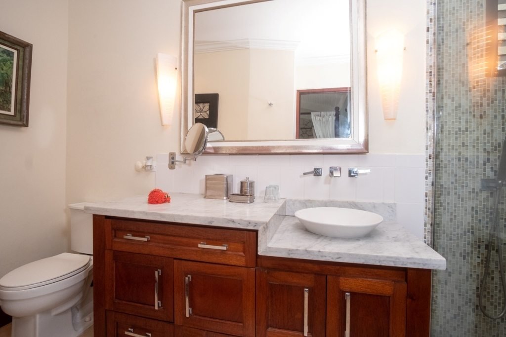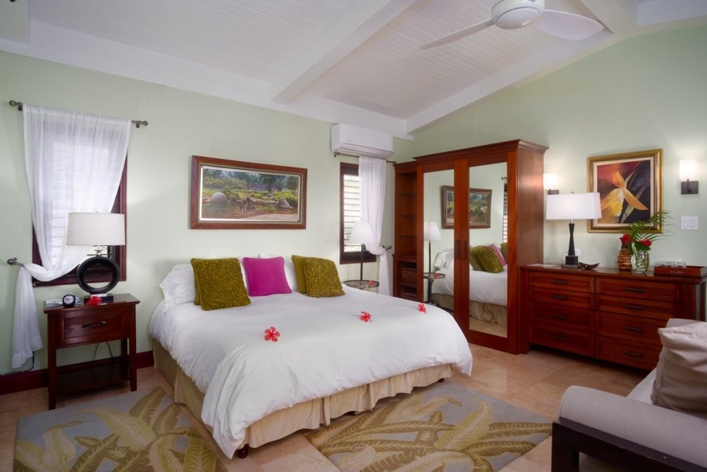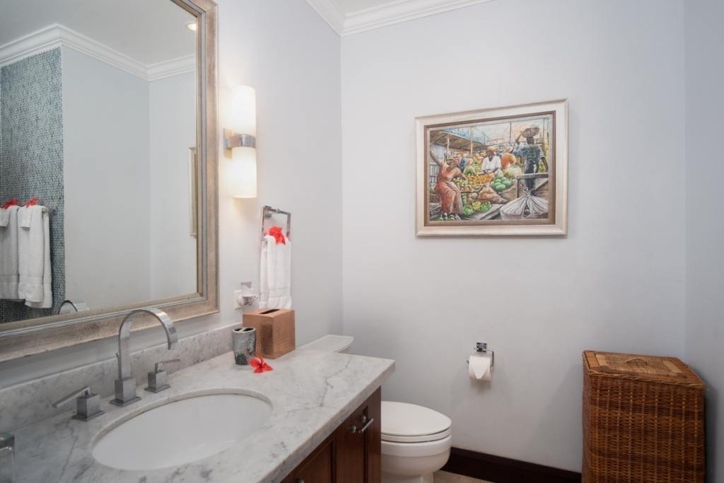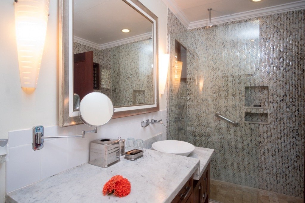 Each bedroom features luxury linens, remote-controlled air conditioning, ceiling fans, flat-screen HD TVs, and elegant en-suite bathrooms complete with marble vanities and rainfall showers. The design offers both comfort and style for a restful stay