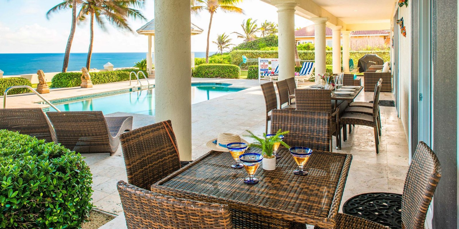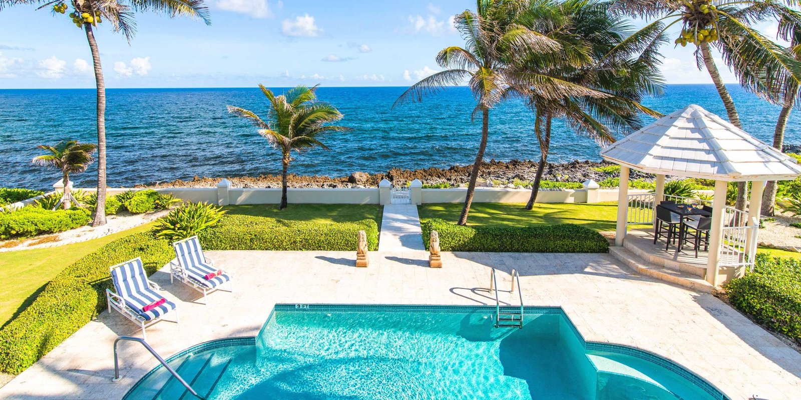 Step inside to a central great room that flows seamlessly to the outdoors, where a private freshwater pool awaits. The poolside sundeck features comfortable lounge chaises, while a nearby gazebo invites guests to savor alfresco meals by the sea.
