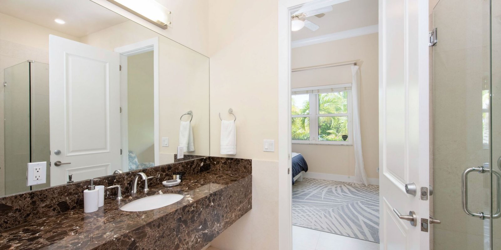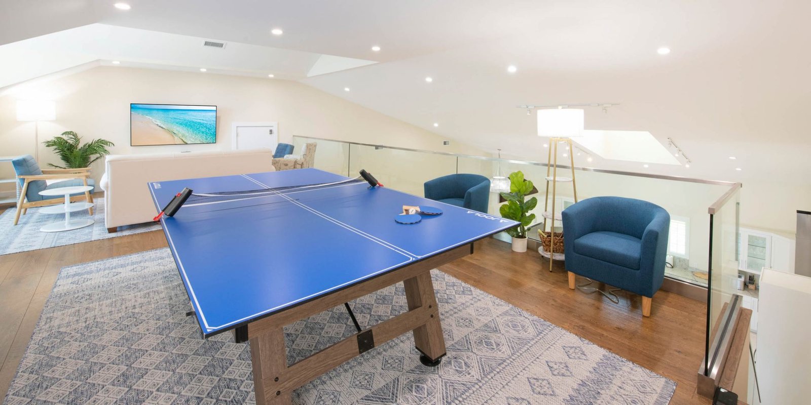 Perched above the main living space is a mezzanine loft enclosed by a sleek glass railing. This cozy media room boasts a dormer window offering panoramic ocean views—perfect for movie nights with a seaside backdrop.
