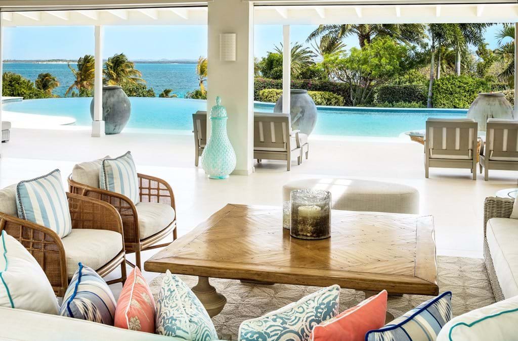 The enchanting pathway through the courtyard opens onto a grand living space, where sweeping views of the sea stretch beyond a glistening infinity pool, creating a breathtaking scene of elegance and serenity.