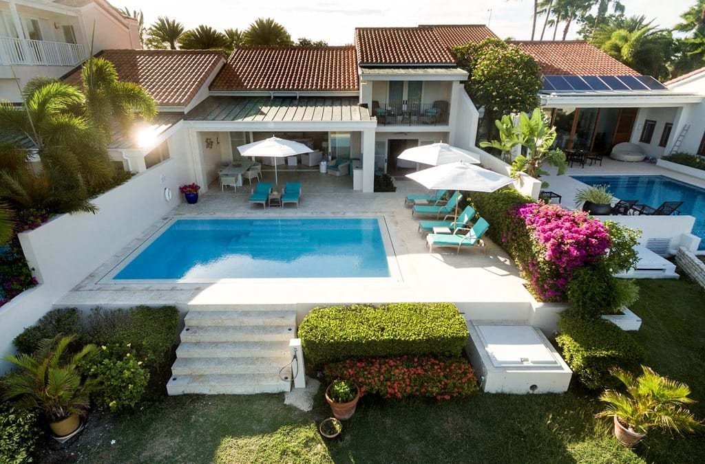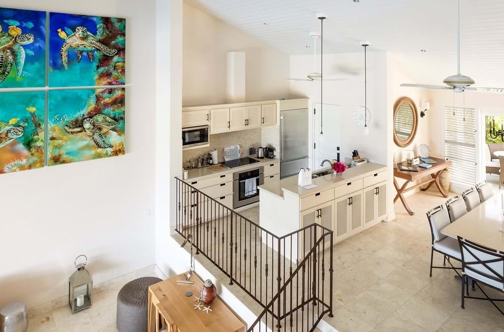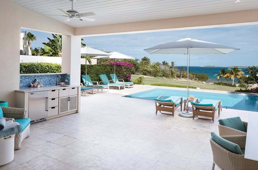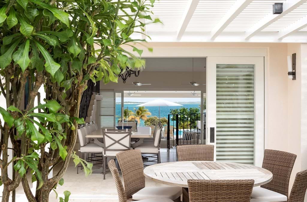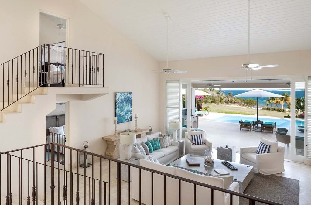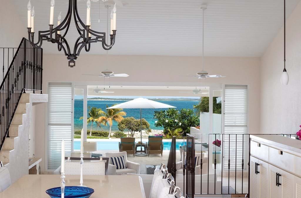 The atmosphere is one of comfortable elegance, defined by a soothing palette of neutrals, celadon, and ocean blues. Stone floors and crisp white woodwork create an airy freshness, while tongue-and-groove ceilings with recessed lighting add a modern touch. Thanks to the open floor plan, the first glimpse on arrival is of the turquoise sea stretching out beyond, with living spaces flowing seamlessly from dining to lounge to the outdoors.