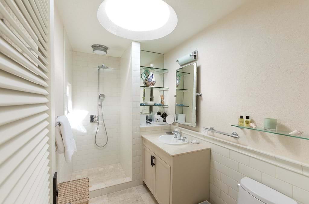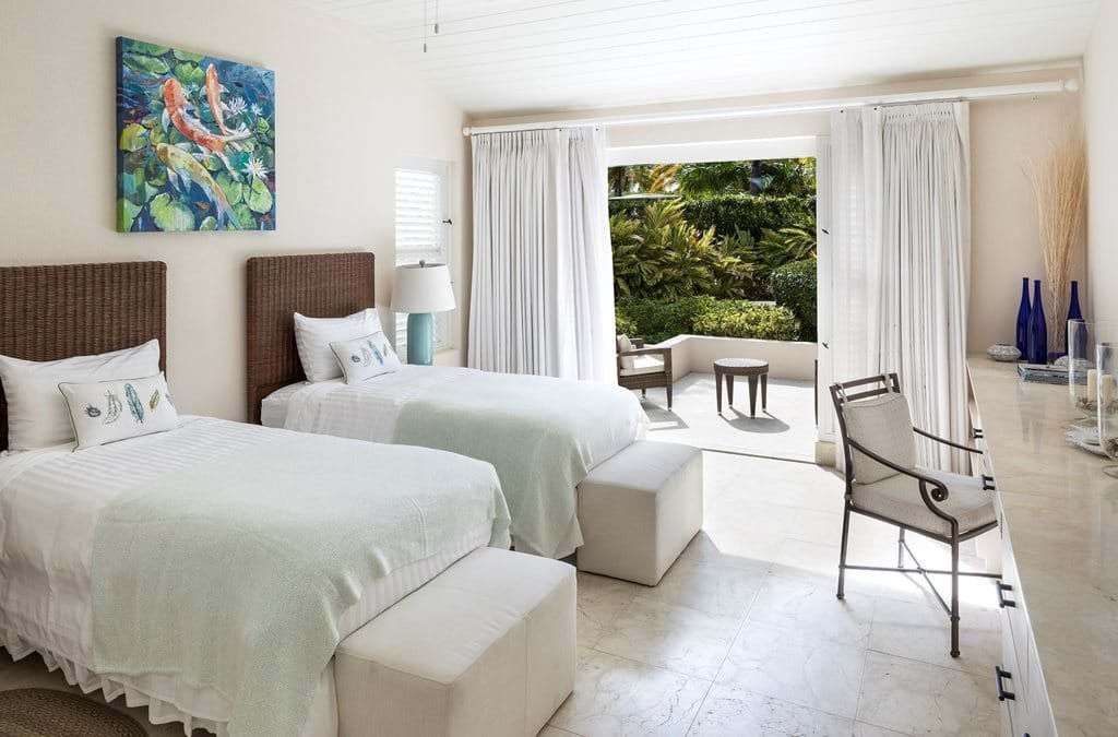 On the ground floor, a king-bedded guest room opens to a private terrace with steps down to the pool. Its bathroom features a dressing area, walk-in closet, oversized double vanity, and a spacious walk-in shower framed in stone and teak. A twin-bedded room is also located on this level, offering a charming garden terrace and en-suite shower.