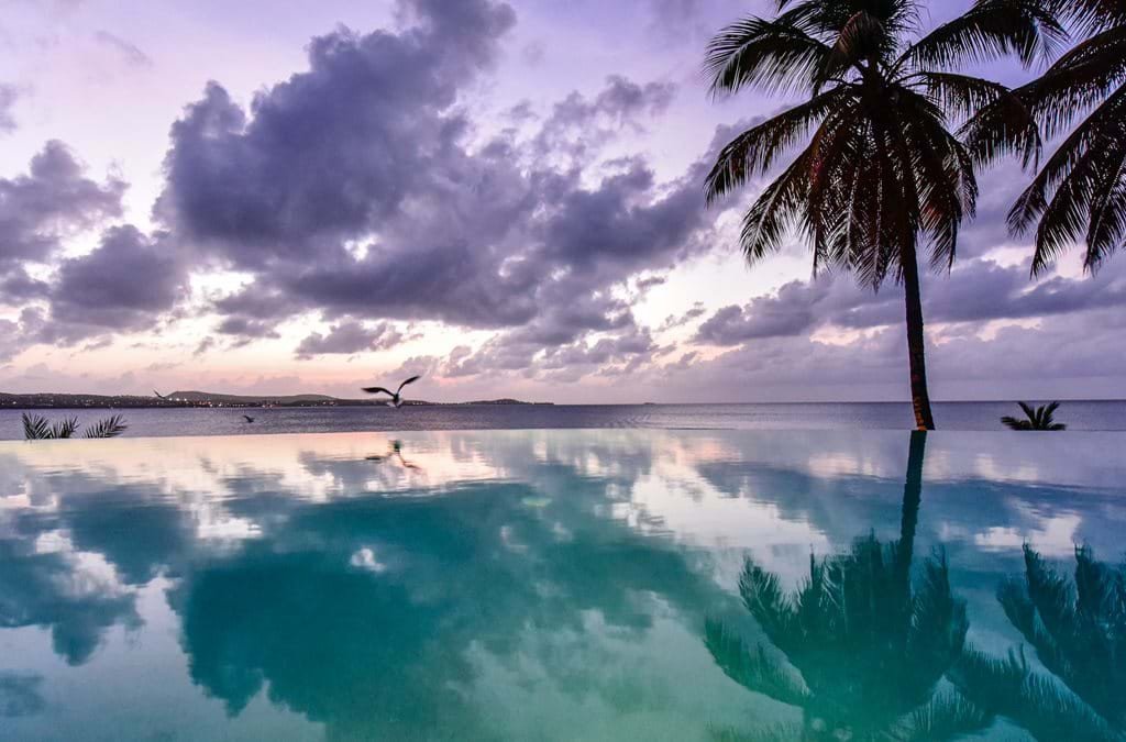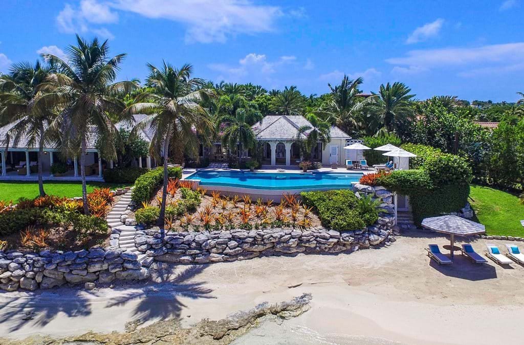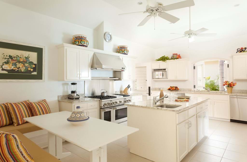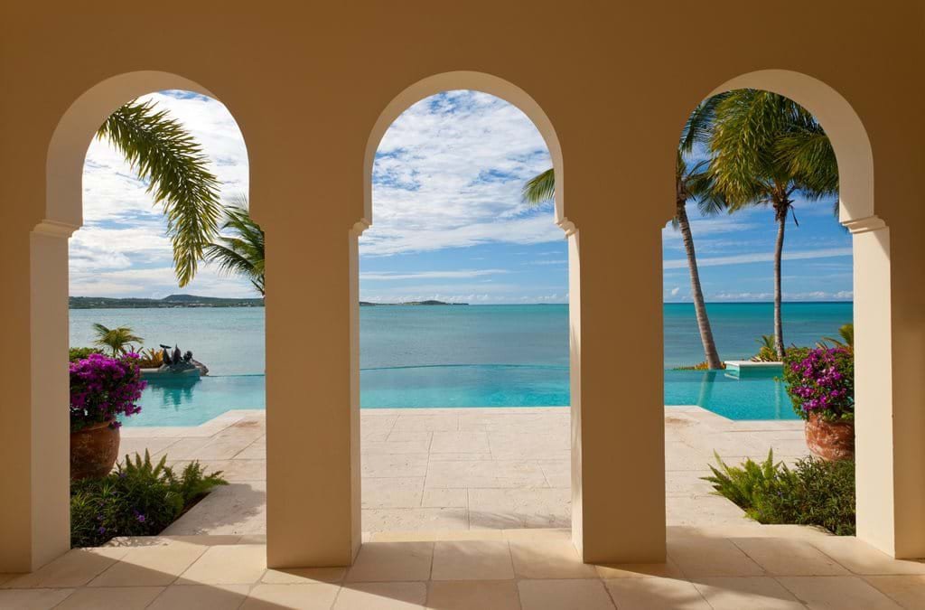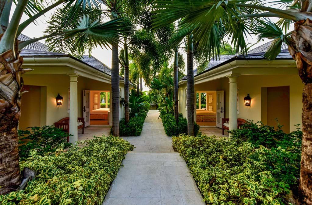 The main residence and guest quarters are connected by a palm-filled courtyard, its green mosaic tiles creating a serene backdrop. Within this tranquil setting, guests are immersed in a relaxed Caribbean ambiance, with warm-toned walls, hand-carved light fixtures, and wicker loungers draped in flowing white fabric.