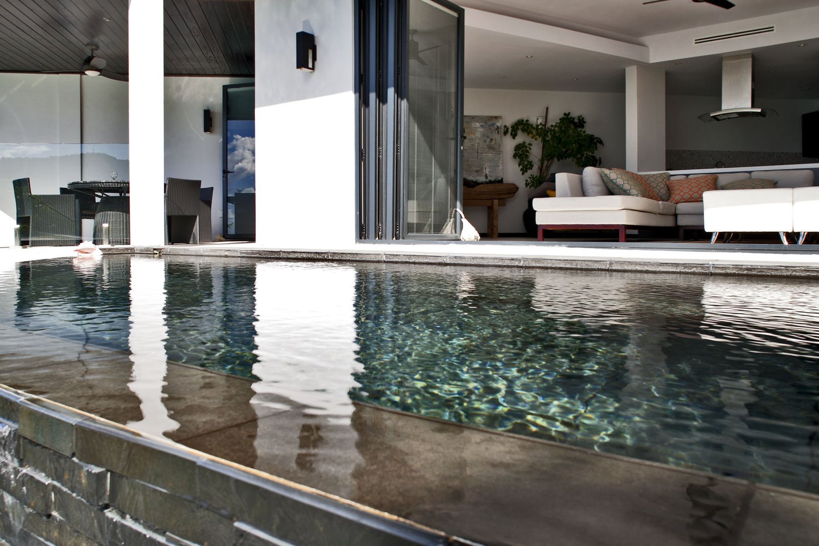 On the ground level, an open-plan kitchen flows into the living and dining area, all opening onto a sun deck with an inviting infinity-edge pool. Upstairs, two en-suite bedrooms provide privacy and comfort. The master suite includes both a soaking tub and a walk-in shower, while each bedroom features its own balcony with sweeping ocean vistas.