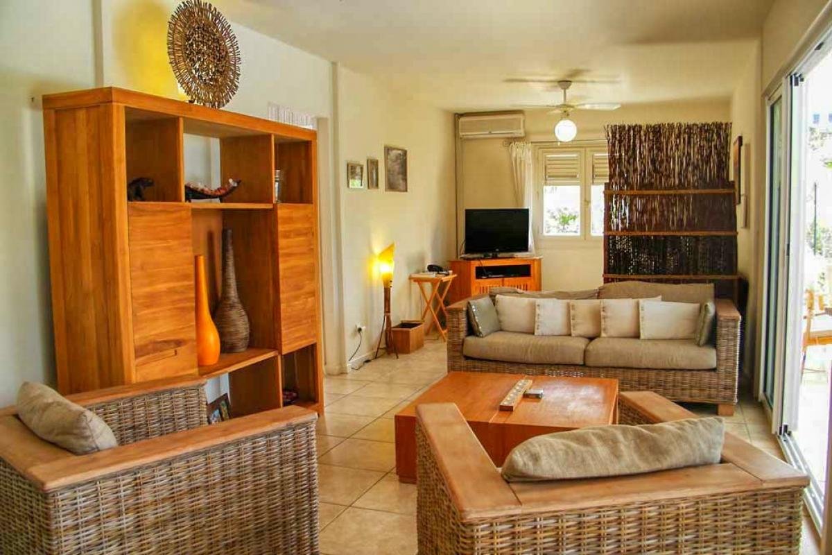 A spacious living room with television and lounge area facing the pool