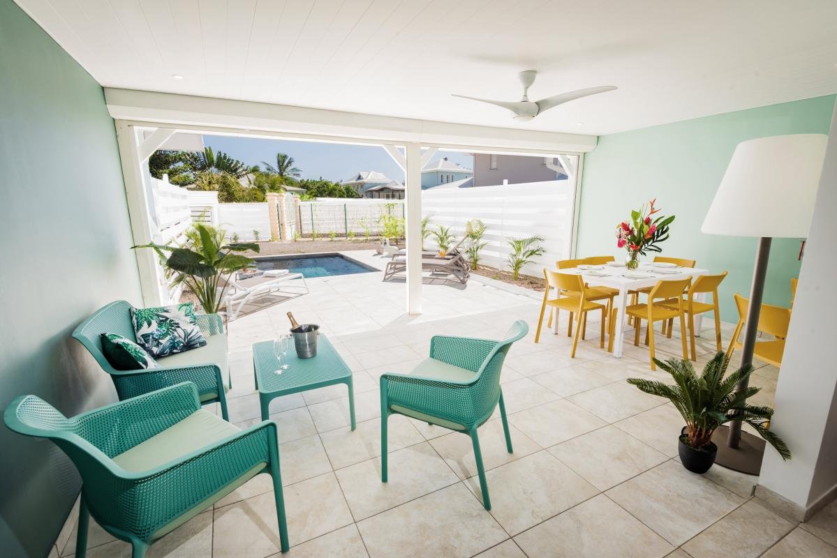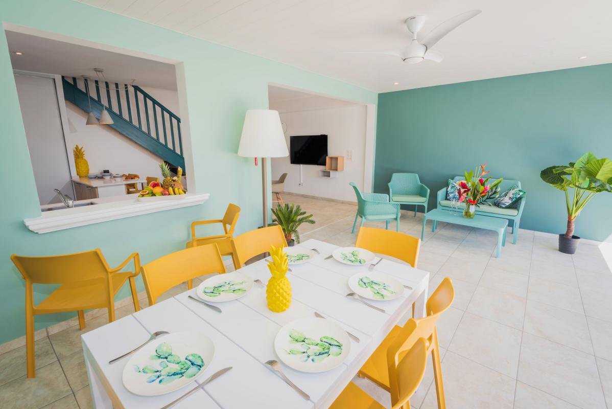 Open-plan living room with a lounge area, flat-screen TV, and a large dining table, opening onto the terrace and pool.
