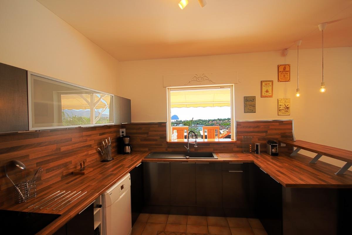 • A well-equipped American-style kitchen, boasting stunning views of both the pool and the sea.