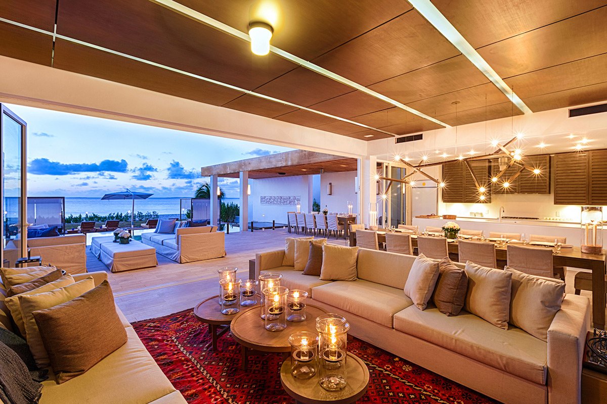 Soothing interiors in soft blues and neutrals echo the beauty of the tropical surroundings. One villa offers six bedrooms, while the second features five bedrooms including an expansive master suite. Together, they may be booked to provide 11 bedrooms accommodating up to 22 guests. Each residence includes rooftop and patio gardens, a guest and chef’s kitchen, a home theater, and a gym.
