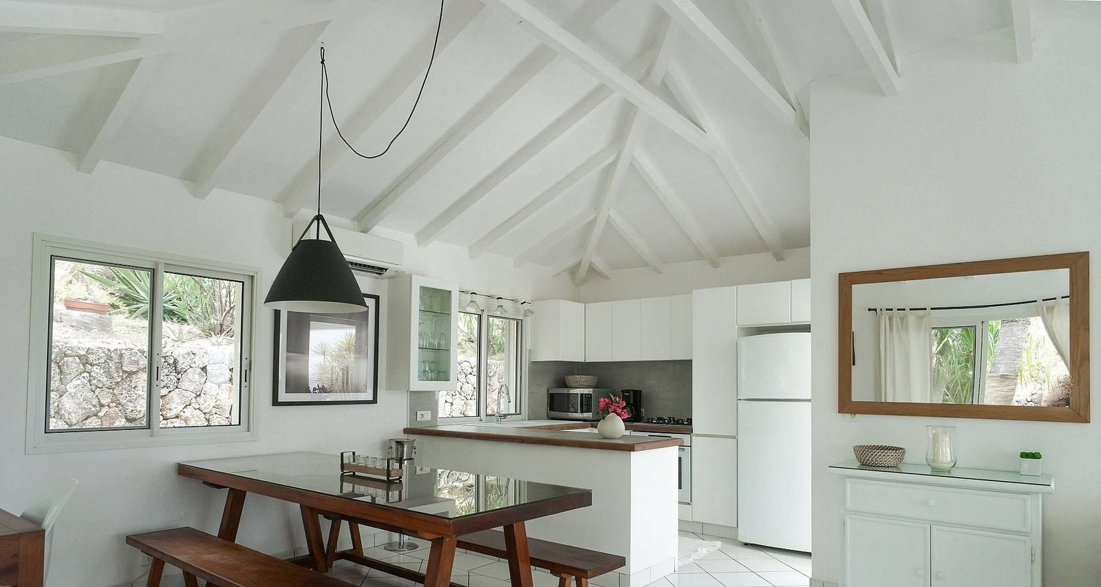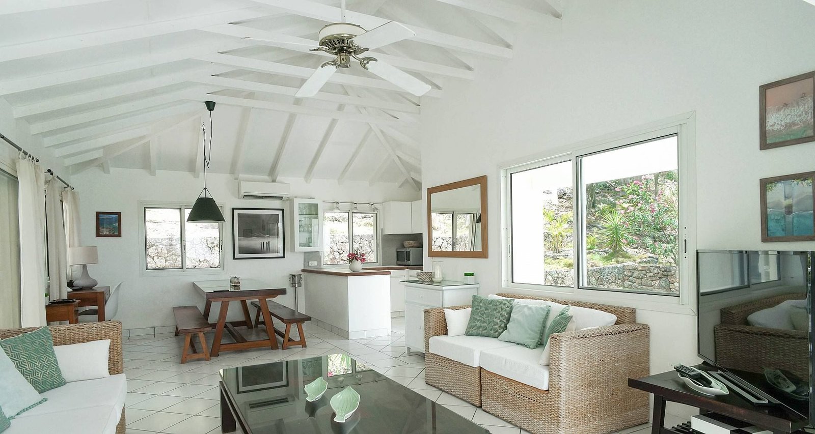 The living room features plush sofas in soothing neutral shades, opening toward the outdoors and capturing the fresh island breezes. A cheerful modern kitchen, accented in blue, is separated from the lounge by a practical breakfast bar. Three bedrooms and two bathrooms complete the home, each light-filled and tastefully decorated to enhance the serene Caribbean lifestyle.