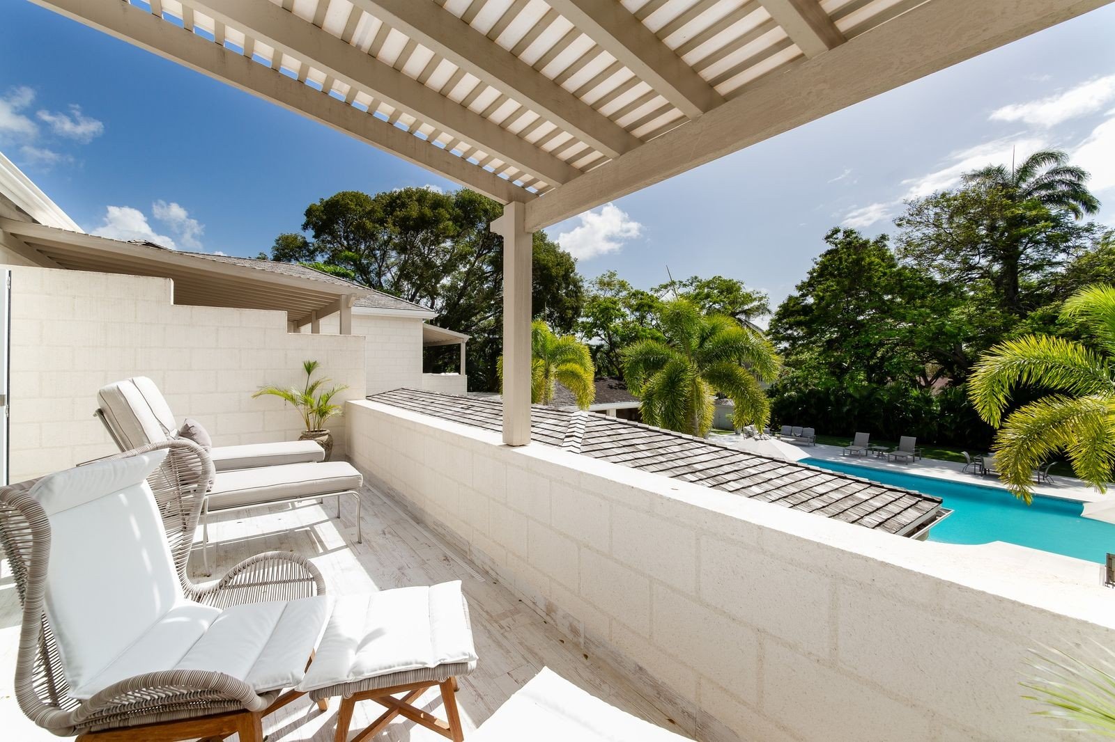 The upper level houses two master suites and two additional guest bedrooms, each with its own en-suite bathroom and private patio overlooking either the pool, the landscaped gardens, or the golf course beyond.