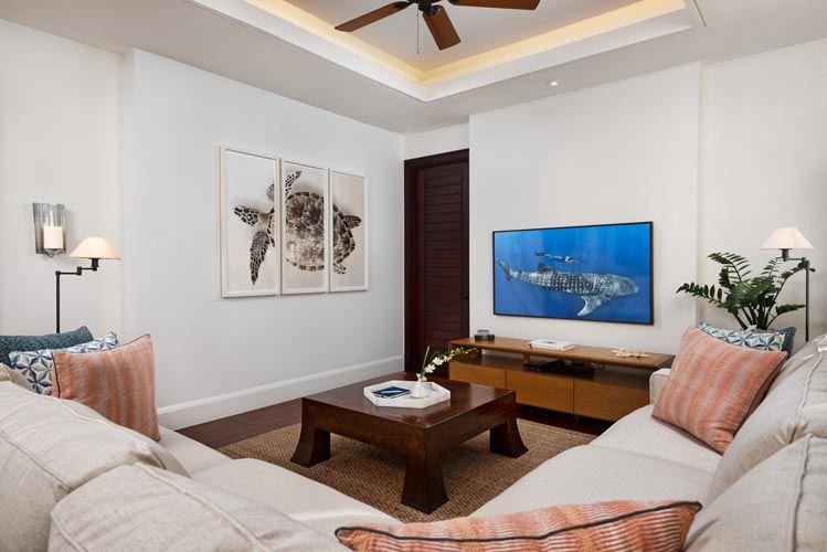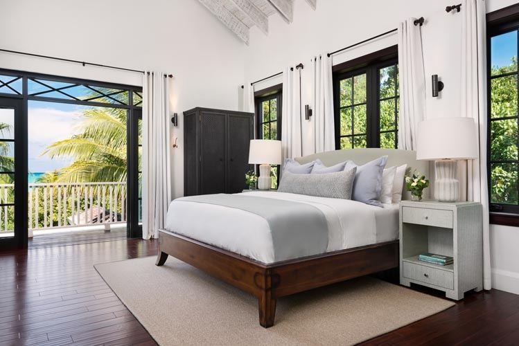 This two-story, L-shaped Colonial-style residence is nestled discreetly in a sunset-facing cove, offering breathtaking panoramic views across seven miles of soft white sand, turquoise waters, and the surf-topped coral reef beyond.