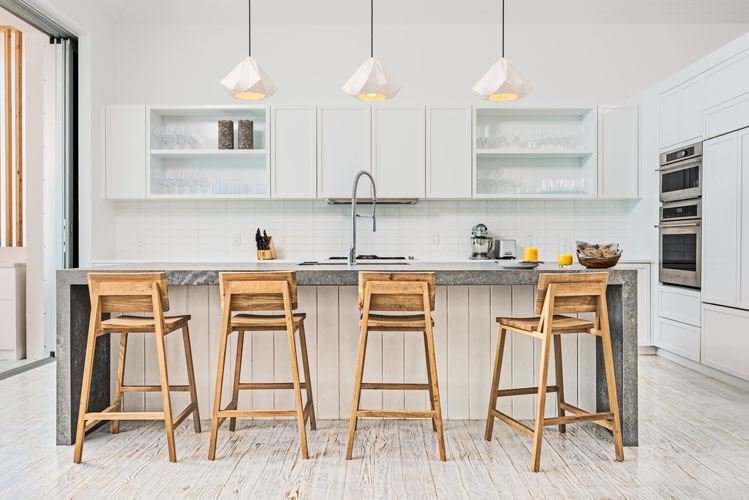This elegant residence features four ocean-view suites, each with spacious en-suite bathrooms, arranged around a central open-concept great room. At its heart lies a sleek, contemporary kitchen equipped with premium appliances, alongside a generous dining area for eight and a comfortable living room with a large flat-screen television.