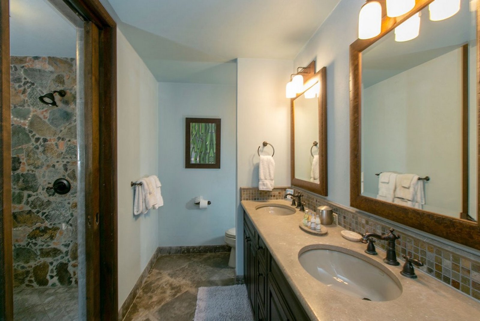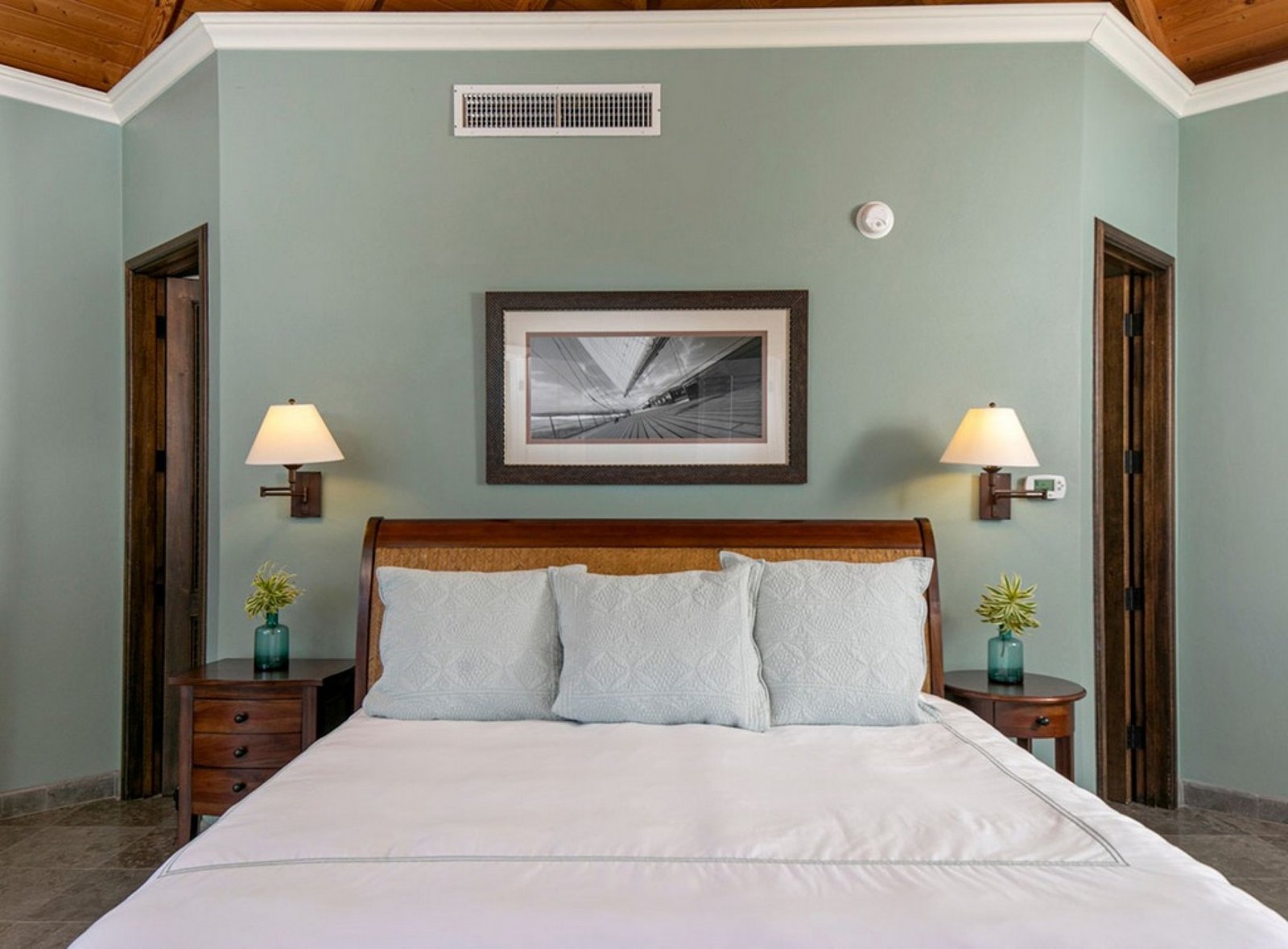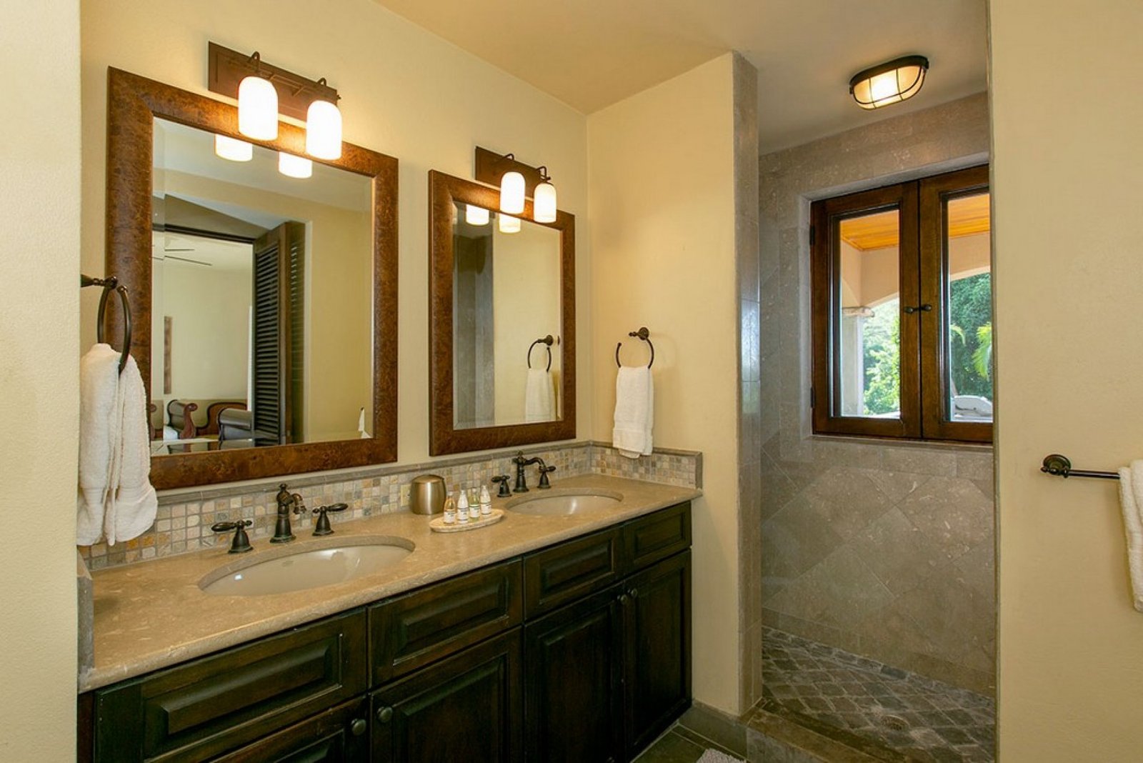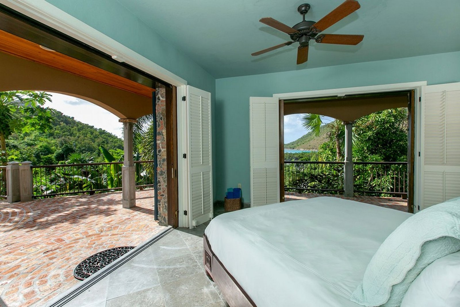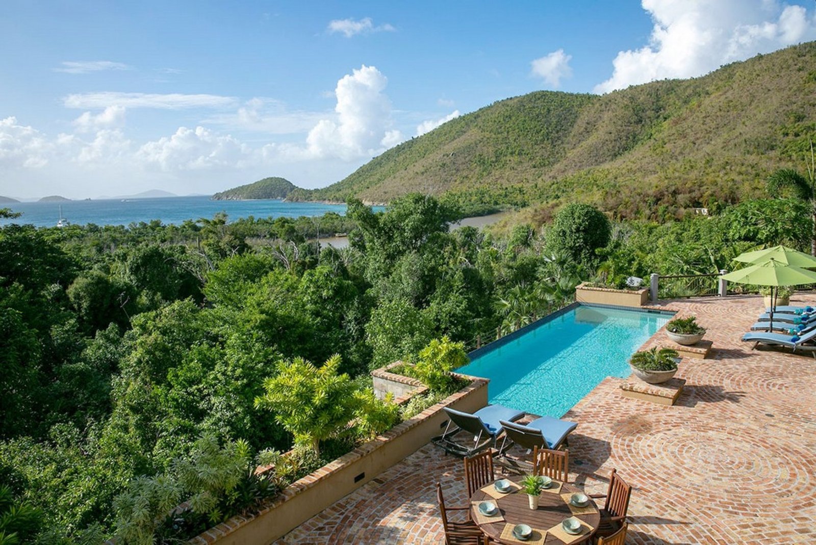 Outside, the pool overlooks the bay, offering spectacular sunset views in a serene, tree-shrouded setting. While nestled in nature, the property remains close to Cruz Bay’s vibrant restaurants—or you can opt for a private chef to craft meals in the comfort of your villa. It’s the perfect combination of privacy, convenience, and island charm