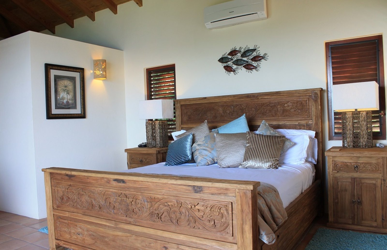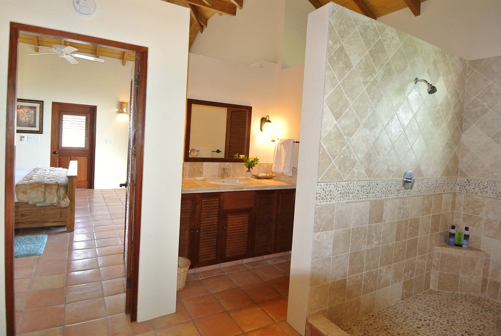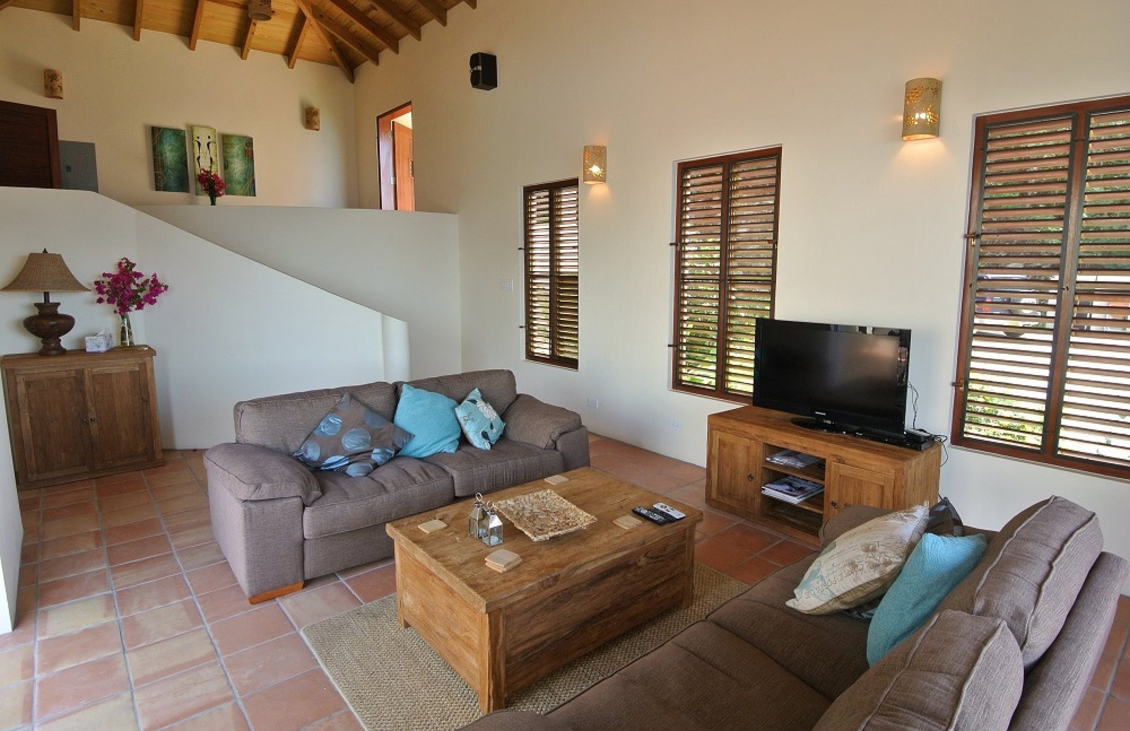 Outside, the main deck invites guests to dine alfresco, take in the ocean breeze under the umbrella, or cool off with a refreshing swim in the pool—all while soaking in the breathtaking island scenery. This villa delivers the ultimate Caribbean vacation experience with comfort, style, and unforgettable views