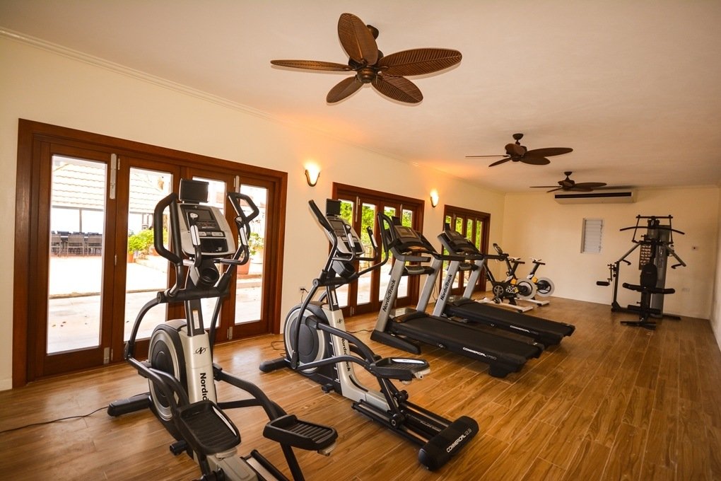 Inside, the main living area opens directly onto multi-level waterfront terraces, flooding the space with ocean breezes and natural light. A dining room just off the living area provides elegant indoor dining with sea views, and a dedicated media corner includes a CD and DVD player. Nearby, guests can enjoy a large game room, a well-equipped exercise room with pool access, and outdoor speakers that enhance the ambiance throughout the day.